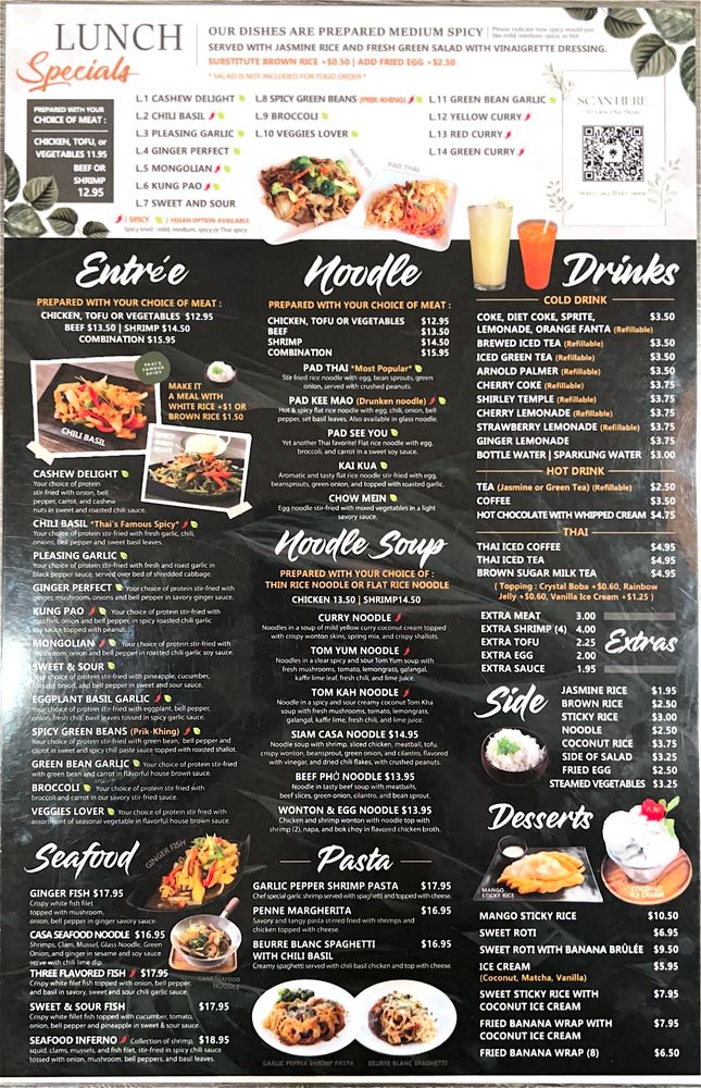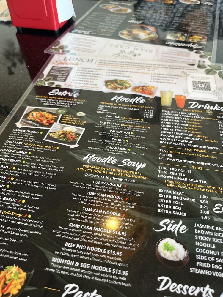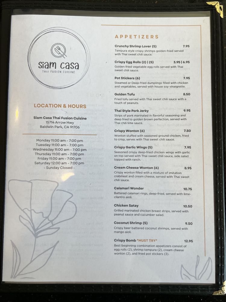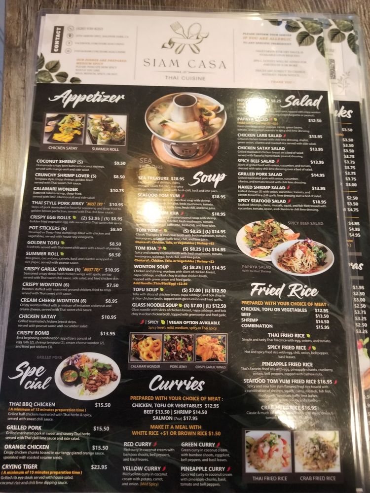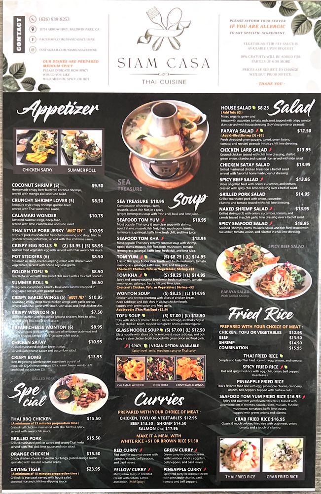 Siam Casa Thai Cuisine, located in Baldwin Park, CA, offers a wide range of Thai dishes with options for vegans and vegetarians. Customers praise the seafood Tom Yum soup, green curry, and crispy wings. The small but pleasant ambiance offers a comfortable dining experience with reasonable prices. The yellow and green curry lunch specials are highlighted as the best curries tasted by customers. The pad see ew and Tom Kha soup have also received high praise for their flavors. While some dishes like the Pad Thai may lack a bit in execution, overall, the food is delicious with great service. With options for takeout, delivery, and catering, Siam Casa Thai Cuisine is a must-try for lovers of authentic Thai cuisine.